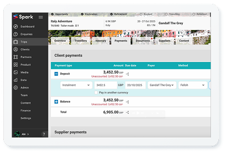 Every payment made through Spark automatically connects back to the booking, keeping your financial data aligned and reconciliation effortless.